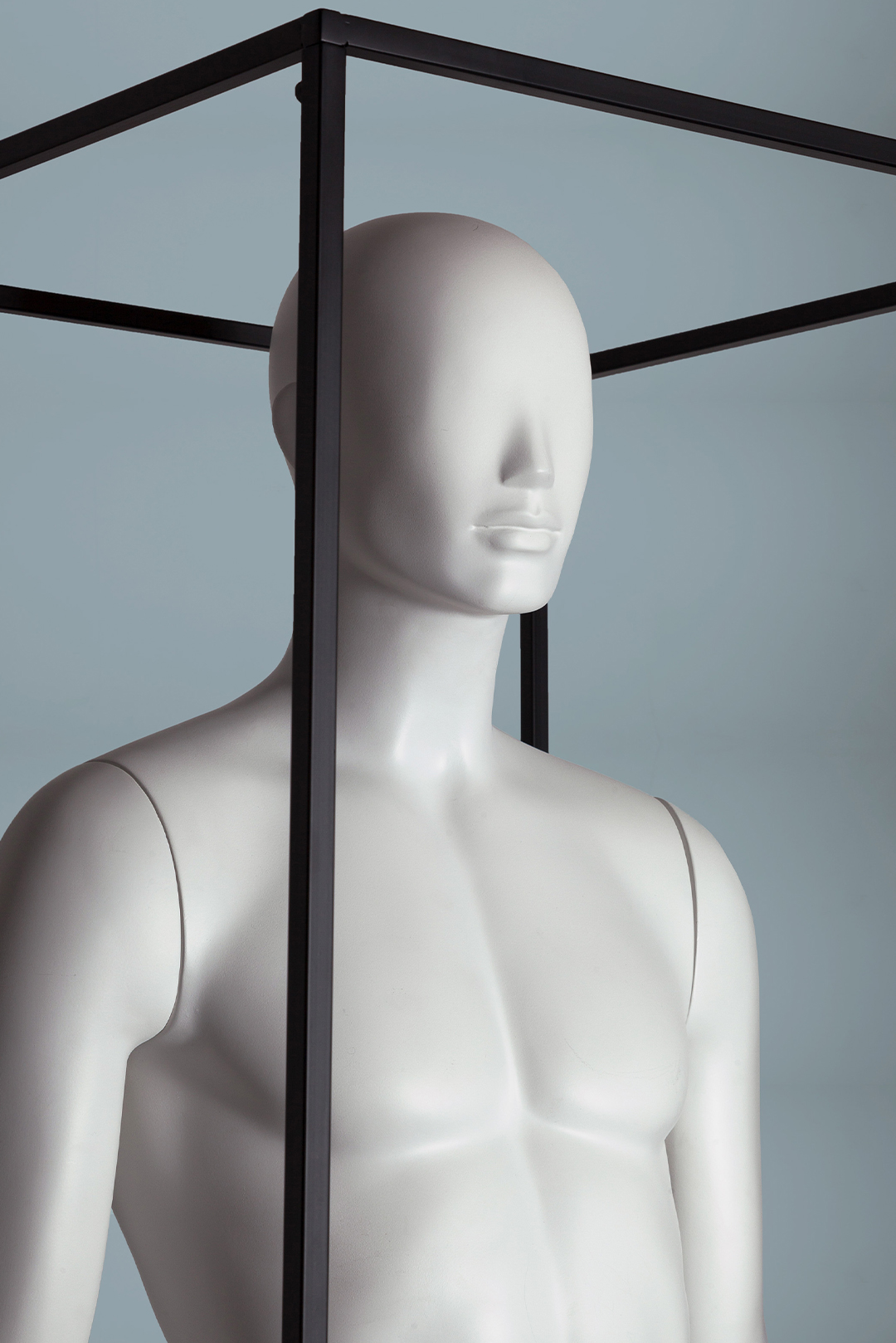 A refined presentation system designed to elevate the form within. The FRAME features a minimalist metal structure that surrounds the mannequin without overpowering it, creating a bold yet balanced visual statement. Its clean lines and architectural silhouette emphasize proportion, posture, and detail—making it ideal for modern retail displays, exhibitions, and editorial space